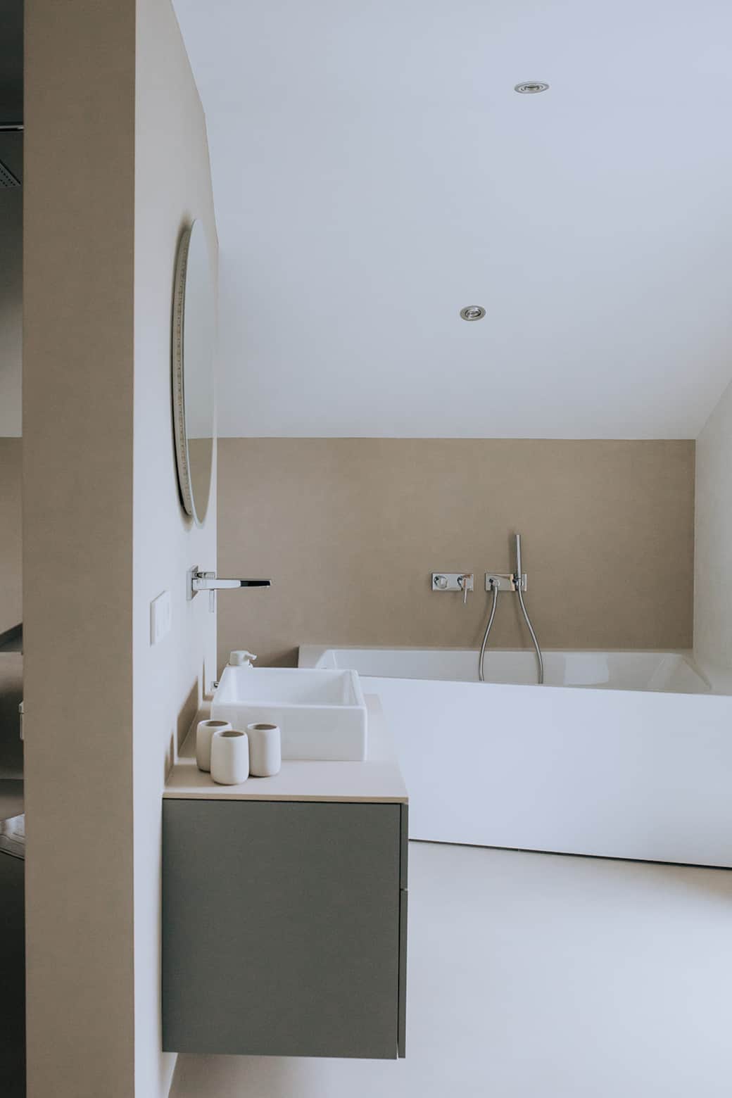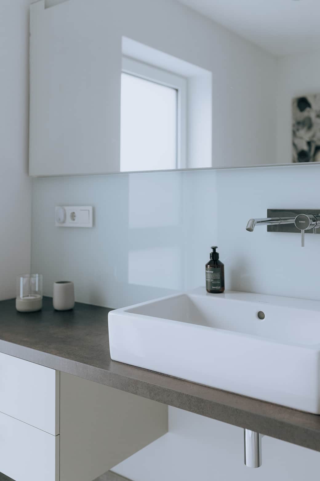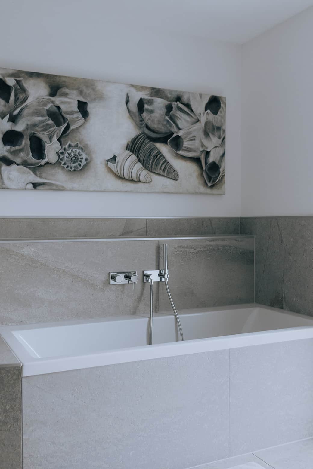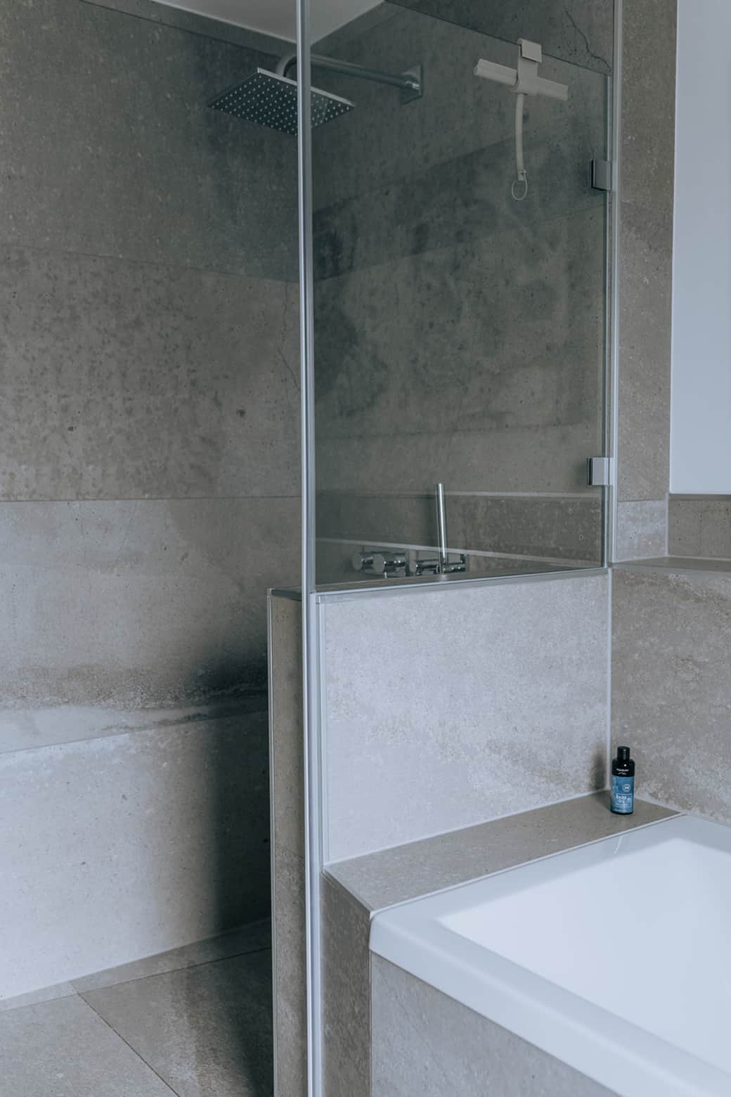 Auf jeder der beiden Etagen befindet sich ein modernes Badezimmer, zusätzlich ergänzt durch ein separates WC im Erdgeschoss. Das Bad im Obergeschoss ist fugenlos gestaltet und besticht durch sein elegantes, zeitloses Design. Im Erdgeschoss sorgen großformatige Fliesen für eine stilvolle und pflegeleichte Atmosphäre. Beide Bäder sind mit einer Dusche und einer Badewanne ausgestattet und bieten zudem ein Waschbecken sowie großzügige Stauflächen für persönliche Pflegeartikel.