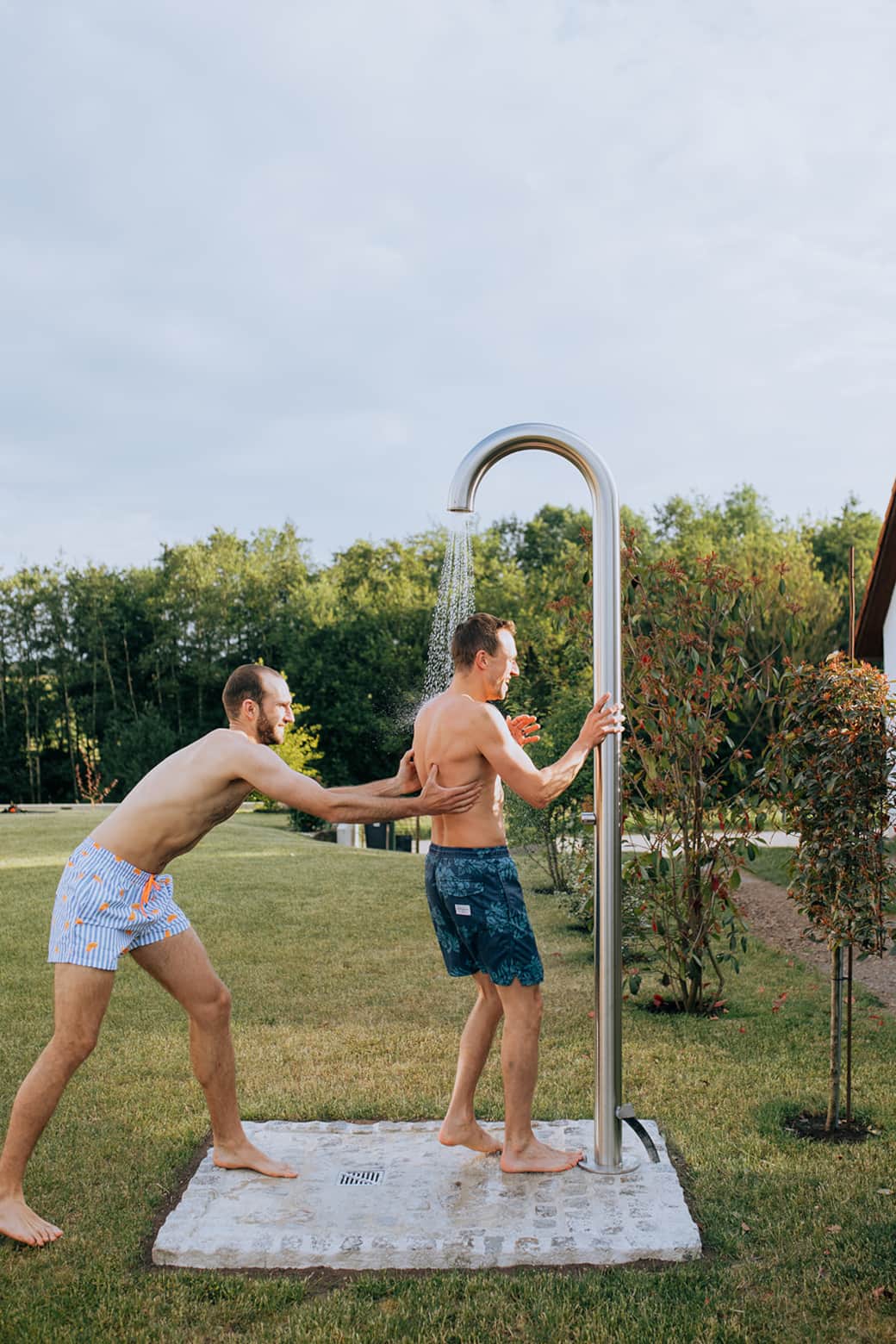 Eine freistehende Außendusche und eine gemütliche Grillecke mit holzkohlebefeuertem Kugelgrill und Außenwaschbecken ergänzen unseren großzügigen Gartenbereich mit über 800 m² Fläche. An warmen Tagen sorgt die hochwertige Wellnessdusche für eine erfrischende Abkühlung, während sie in kühleren Monaten nach dem Baden im Hot Tub für einen belebenden Temperaturausgleich sorgt.