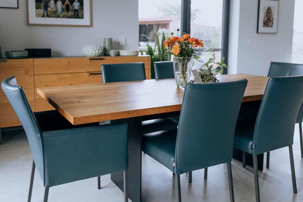 Ein großer Massivholzesstisch und 10 bequeme Stühle laden zu gemeinsamem Essen und geselligen Spieleabende ein. Eine Auswahl an Spielen finden sich im Sideboard. Für unsere kleinen Gäste stellen wir in unserem Ferienhaus gerne bis zu zwei Hochstühle bereit.