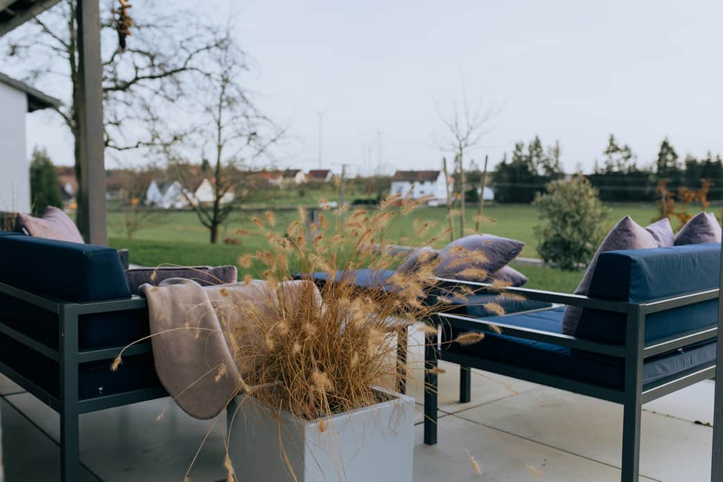 Nach einem Tag voller Eindrücke kehrt Ruhe ein. Auf der Terrasse des Deluxe-Naturhauses S42 öffnet sich der Blick in die Weite der Natur. Frische Luft, sanfte Geräusche, das Gefühl, angekommen zu sein. Hier entsteht Raum für Pausen, für Gespräche oder einfach für den Moment – ganz ohne Programm.